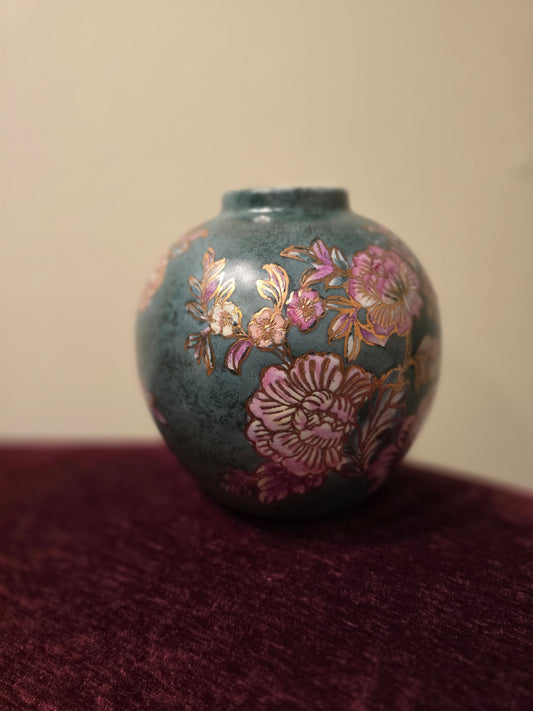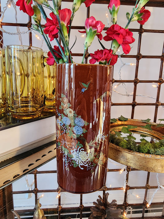 Vintage Brown Floral Japanese Hand Painted Vase with Gold Accents